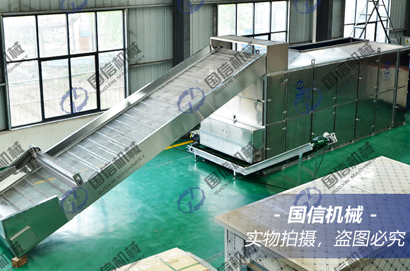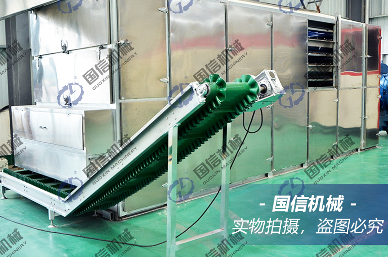 另外一種全自動化加工模式的網(wǎng)帶式食用菌烘干機設(shè)備,主要是針對產(chǎn)量非常大的客戶推出的,每天的建議加工量為六千斤至萬斤以上。干制加工時,只需將清洗挑揀處理好的菌菇放入上料輸送機即可,在設(shè)備內(nèi)部采用的是多層網(wǎng)帶結(jié)構(gòu),通過智能化的控制系統(tǒng)能夠讓菌菇自動上料,進入烘干主機,然后在主機內(nèi)部緩慢勻速移動,在主機內(nèi)部會經(jīng)過4~6次的翻層轉(zhuǎn)換,逐步向出料口移動,與此同時,熱風會從烘干機底部向上穿過載有食用菌的網(wǎng)帶層,對菌菇進行干制,并帶走其中的水分,從而實現(xiàn)逐層干制菌的目的。