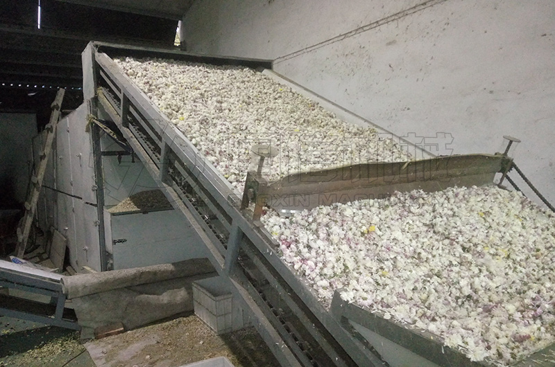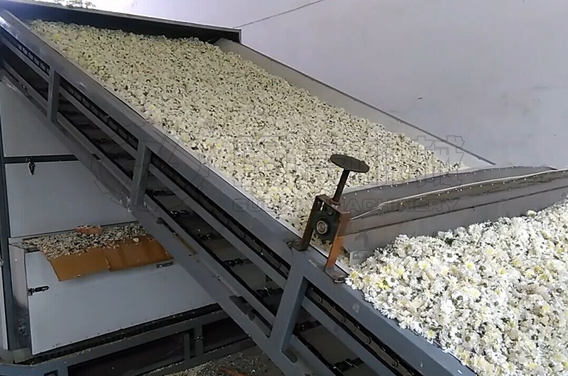 新鮮菊花的烘干我們用無硫烘干法,設(shè)備采用網(wǎng)帶式穿流干燥機進行烘干,通過自下而上穿過網(wǎng)帶及物料層的熱氣流使菊花花朵溫度升高,均勻干燥。